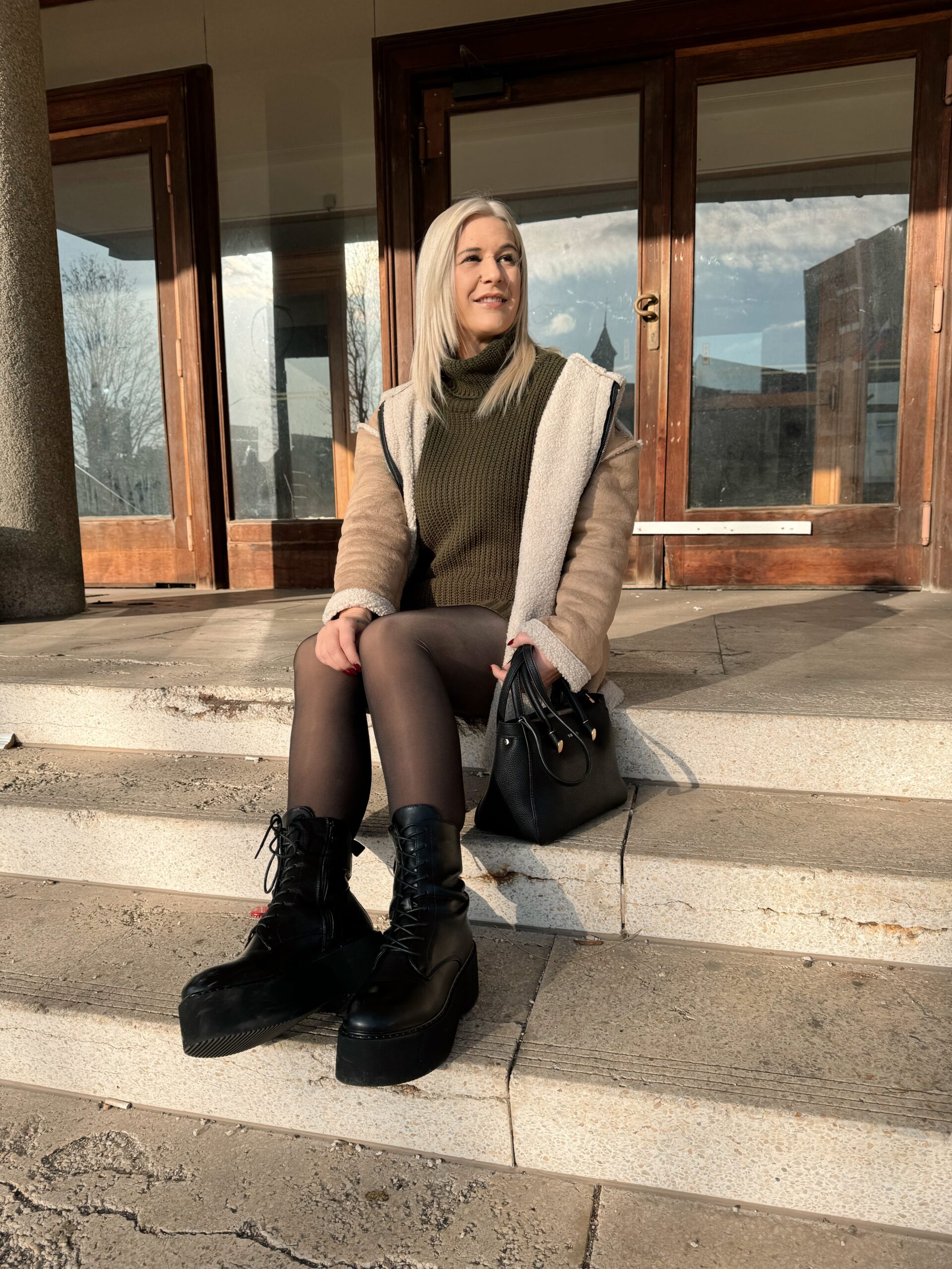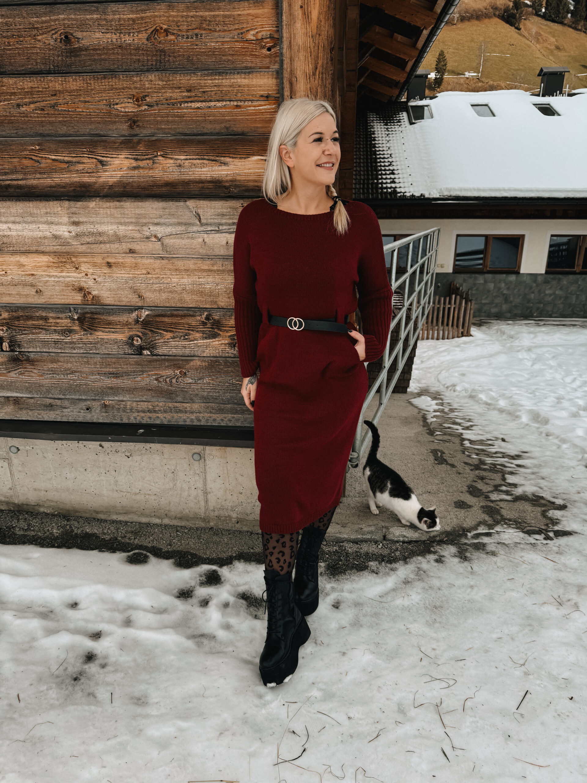 0266 Strickkleid mit Gürtel in khaki, schwarz und bordeaux