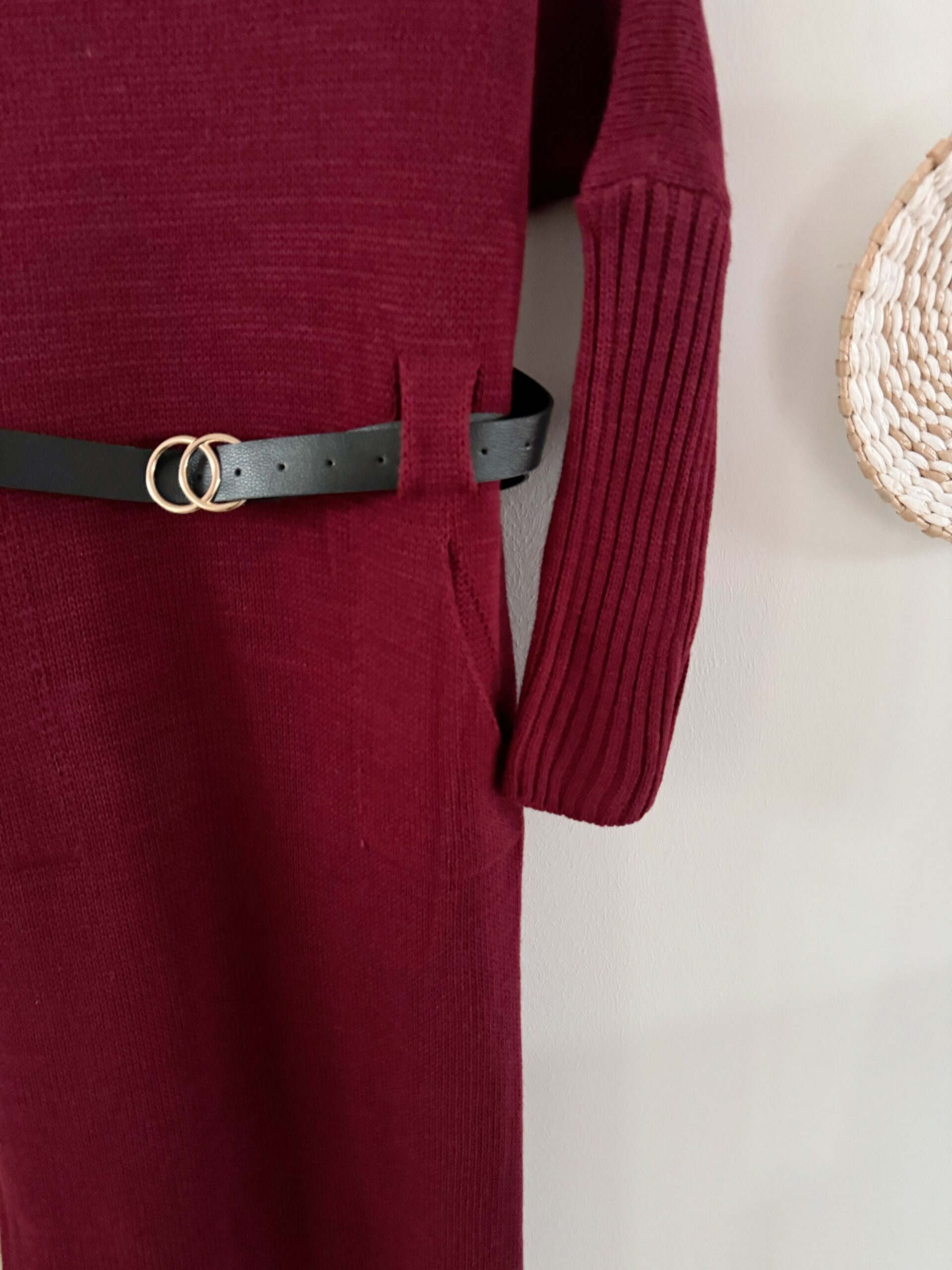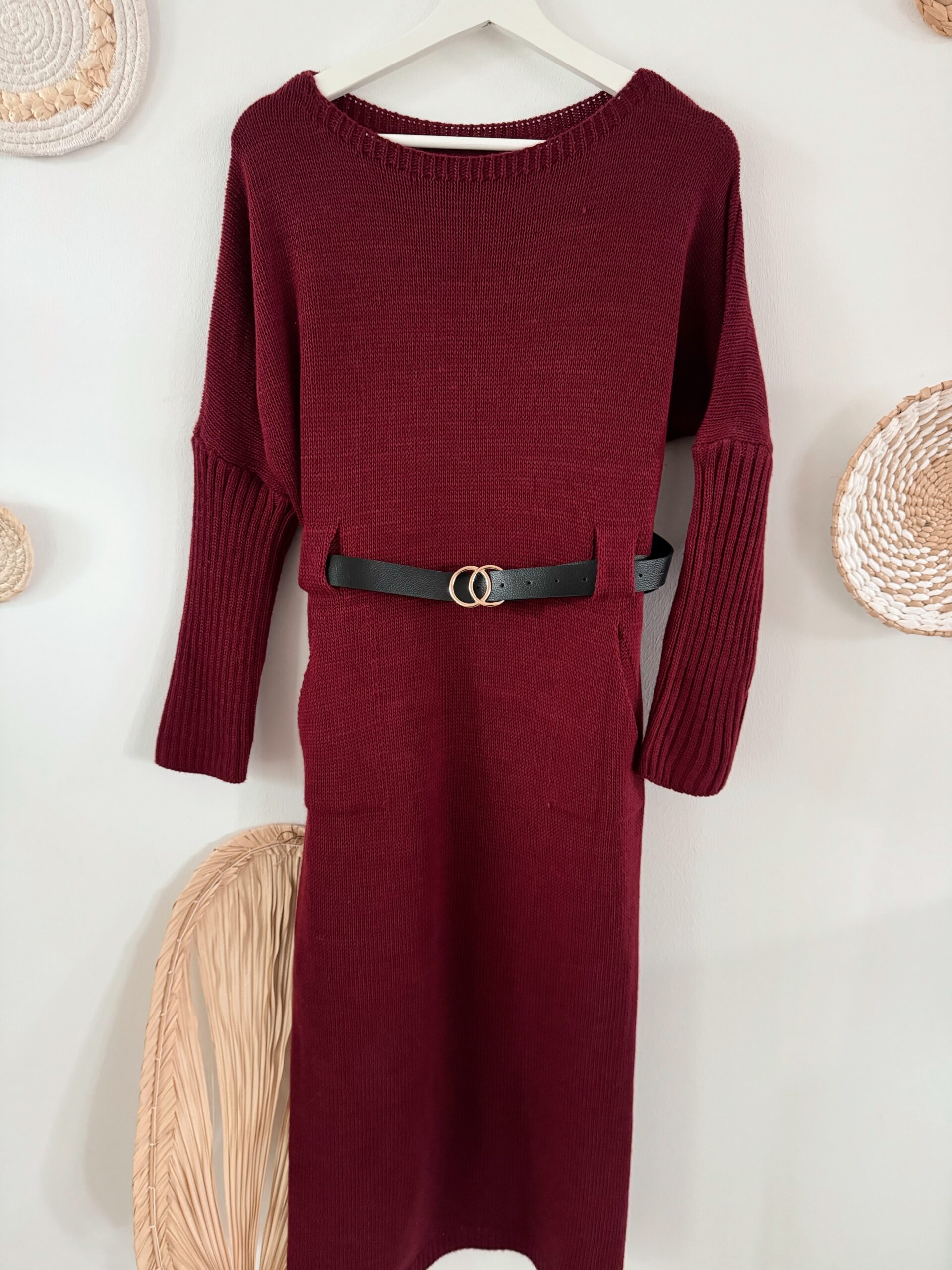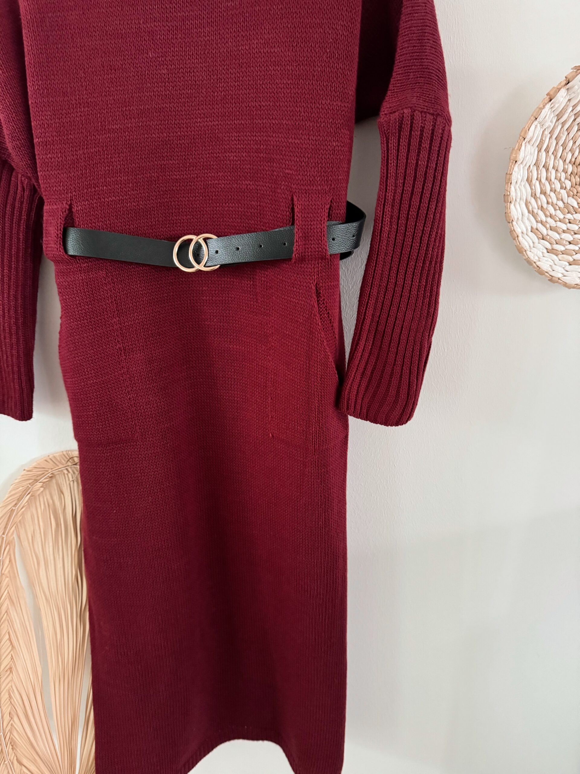 0266 Strickkleid mit Gürtel in khaki, schwarz und bordeaux